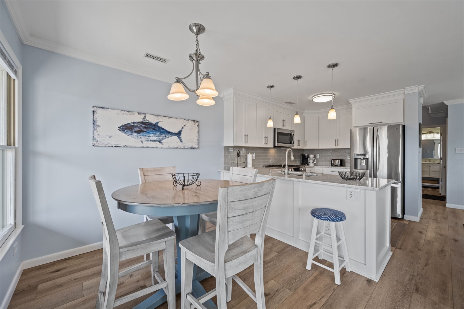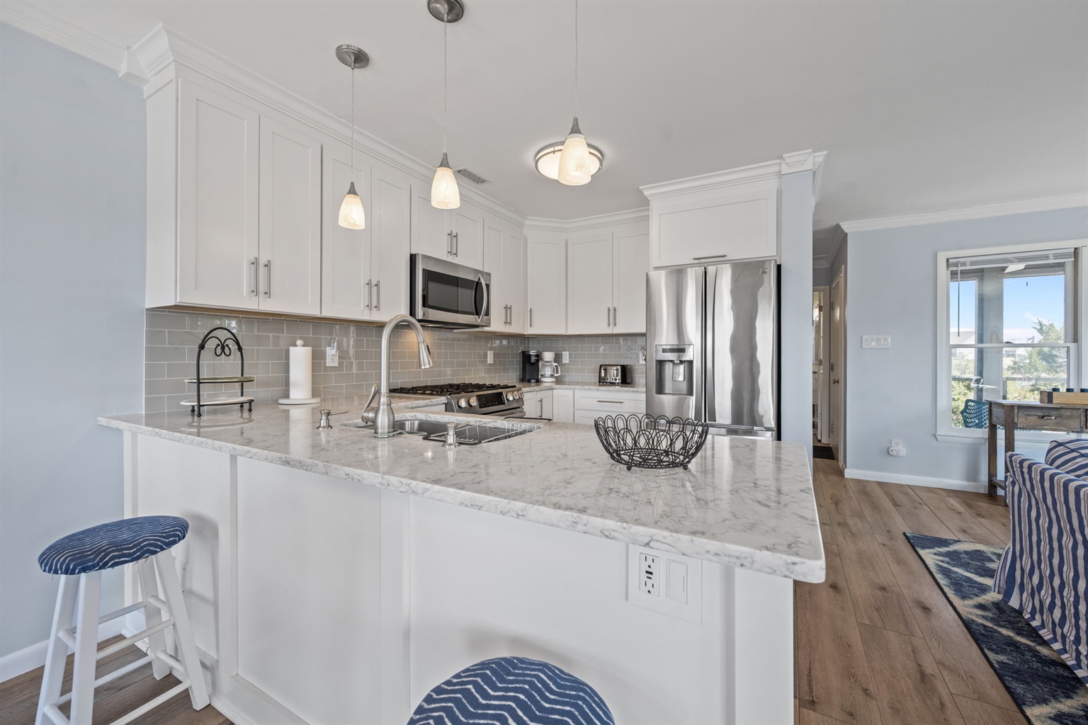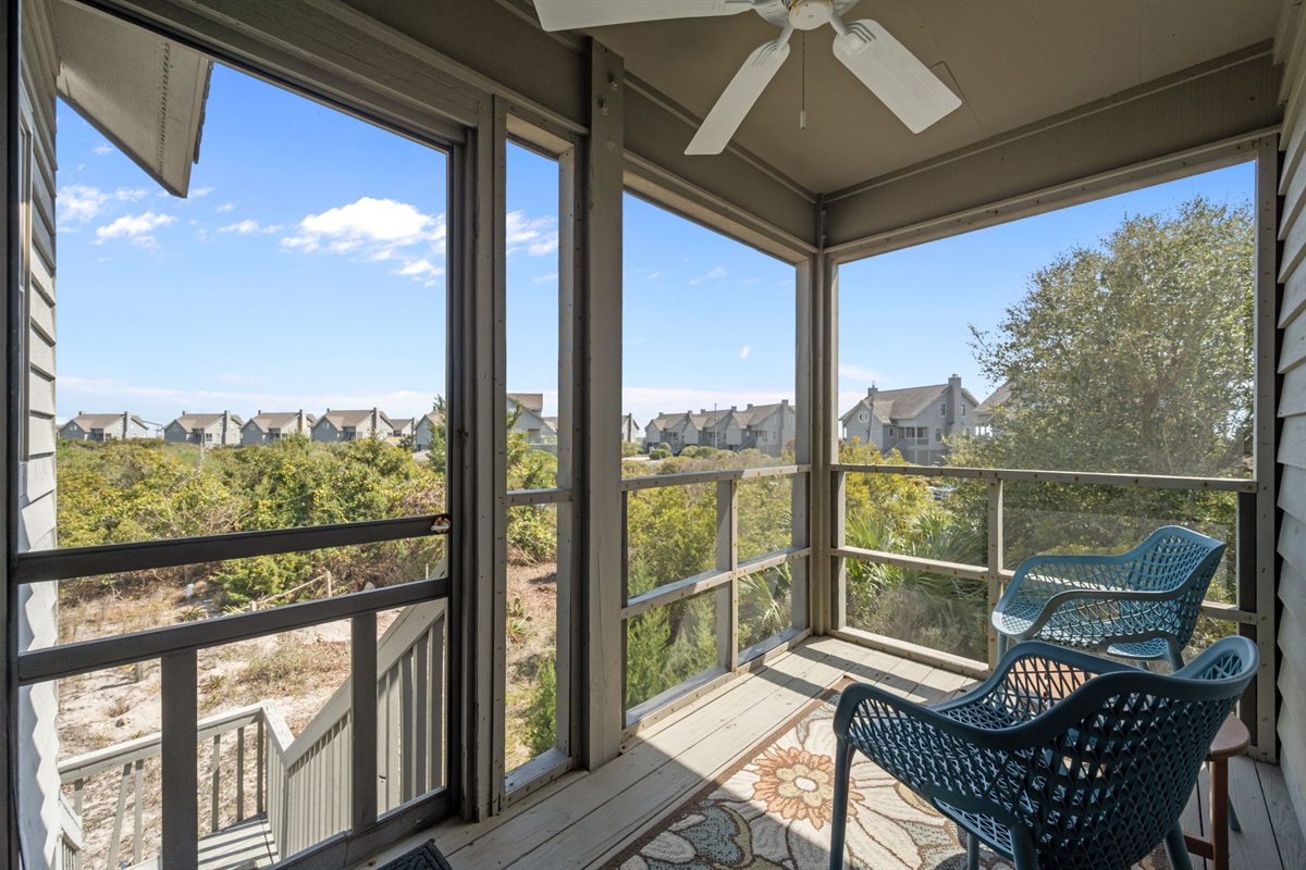 Inside, you’ll find calming blue coastal décor, updated finishes, and a fully stocked kitchen with crisp white cabinetry and stainless steel appliances — perfect for preparing easy breakfasts, quick lunches or fresh seafood dinners. he dining table seats four and there is additional seating for two at the kitchen bar. The open layout of the kitchen, dining, and living area makes it easy to gather, laugh, and reconnect with family and friends. A convenient half bath with washer and dryer makes it easy to refresh and allows you to pack light for your stay. The enclosed screen porch offers coastal views and is the perfect place to take in the scenery, read a book, or sip your favorite cocktail.