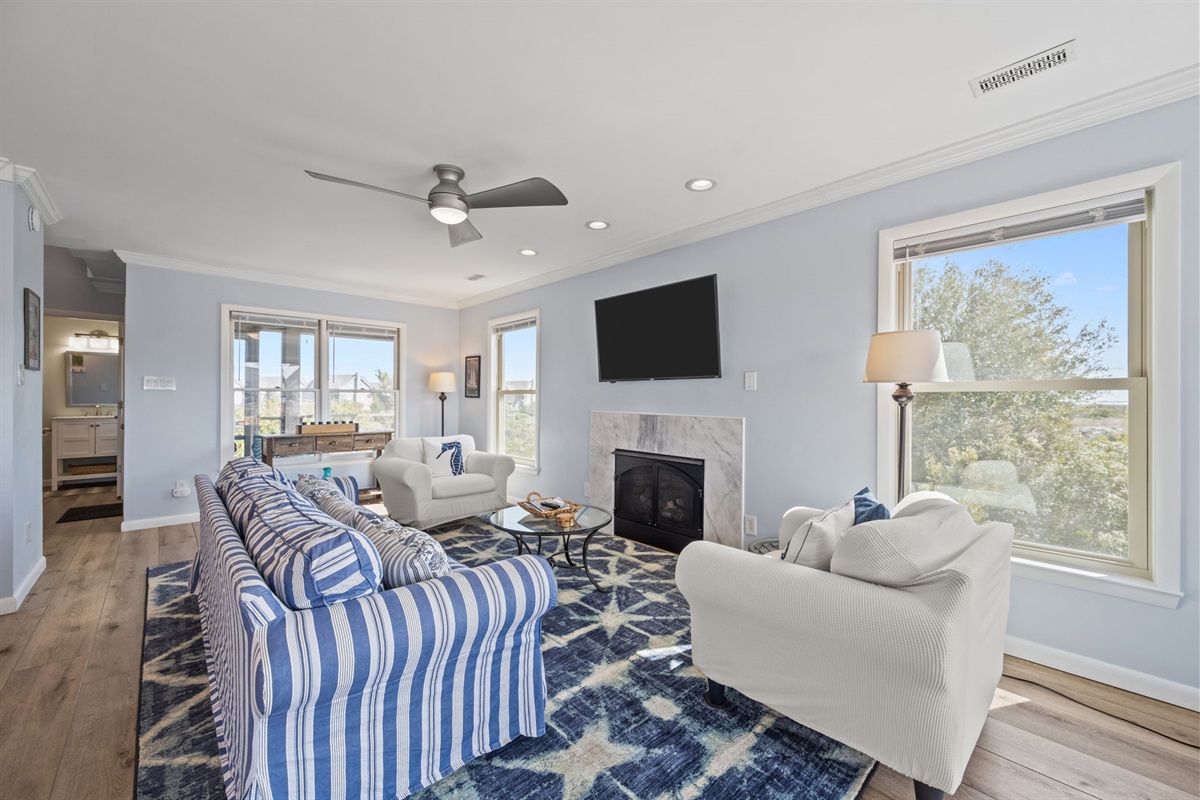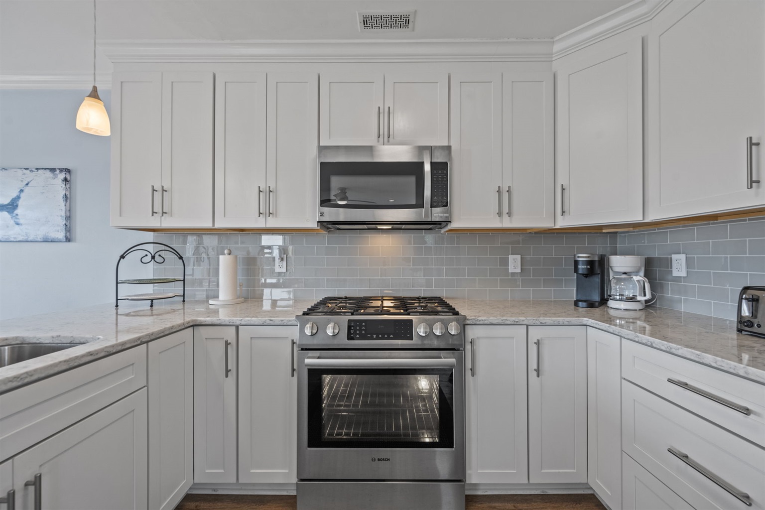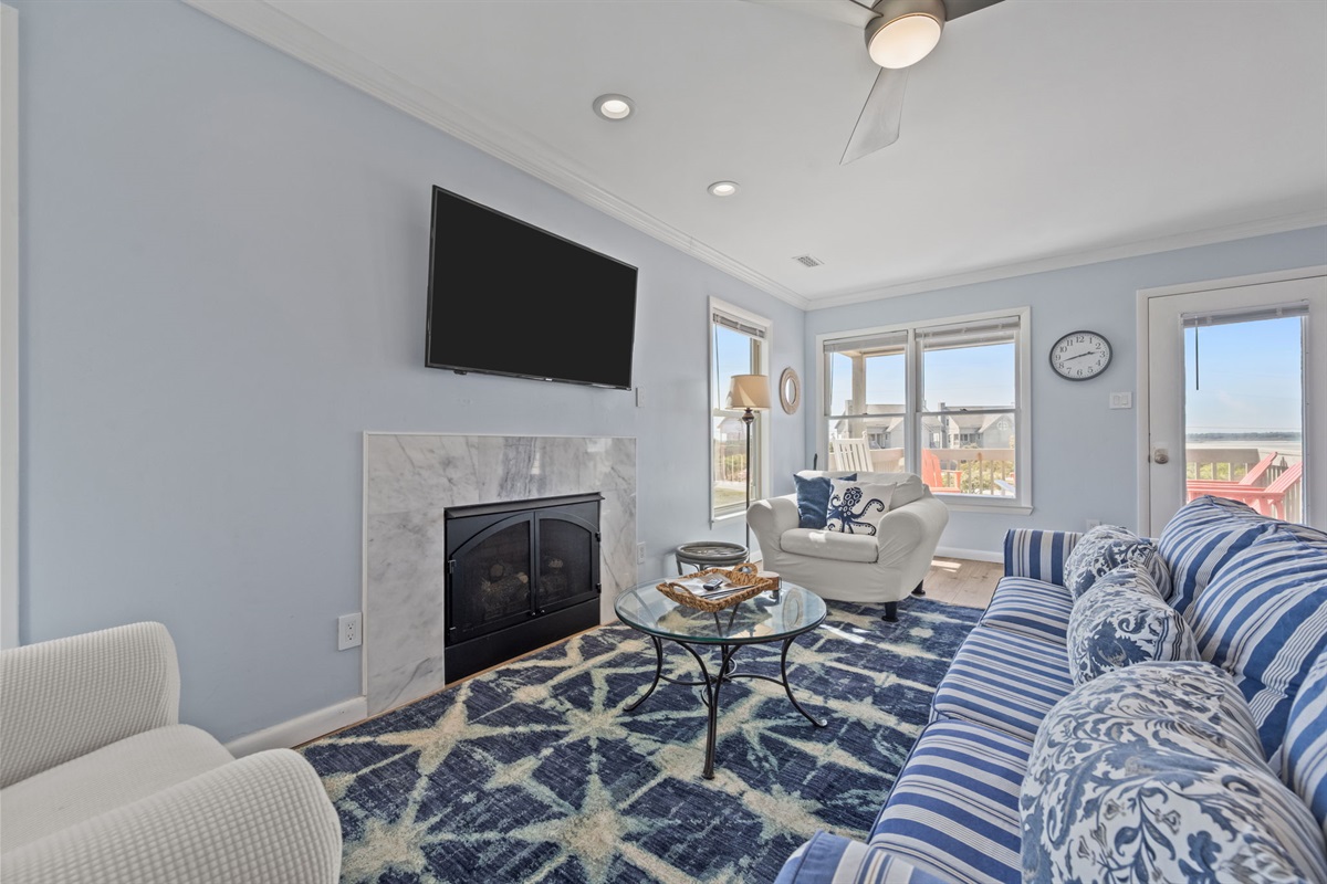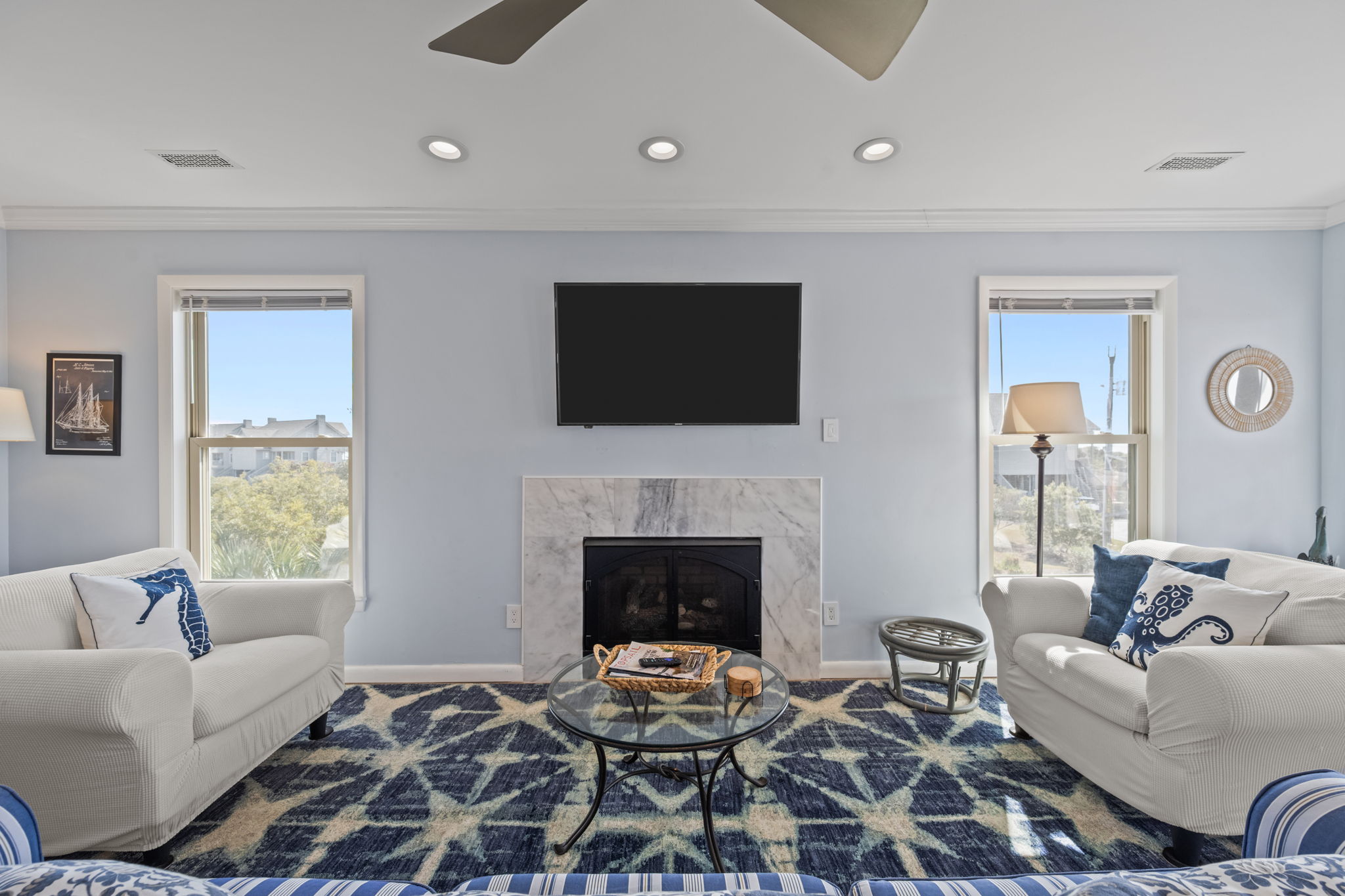 Inside, you’ll find calming blue coastal décor, updated finishes, and a fully stocked kitchen with crisp white cabinetry and stainless steel appliances — perfect for preparing easy breakfasts, quick lunches or fresh seafood dinners. he dining table seats four and there is additional seating for two at the kitchen bar. The open layout of the kitchen, dining, and living area makes it easy to gather, laugh, and reconnect with family and friends. A convenient half bath with washer and dryer makes it easy to refresh and allows you to pack light for your stay. The enclosed screen porch offers coastal views and is the perfect place to take in the scenery, read a book, or sip your favorite cocktail.