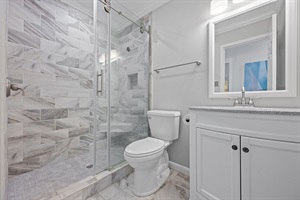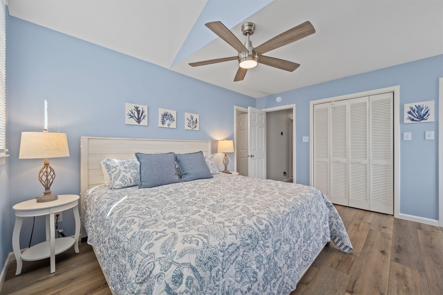 Upstairs, unwind in one of the two bedrooms. The primary suite offers a king-sized bed, a ceiling fan, TV, and an abundant amount of storage, giving you plenty of space to unpack and settle in comfortably. The private ensuite bathroom makes getting ready easy and features a beautifully tiled walk-in shower and updated fixtures. The second bedroom is a family-friendly space perfect for kids or extra guests. It features a twin-over-full bunk bed plus an additional twin bed, providing comfortable sleeping for up to four. With bright, beach-inspired décor, plenty of room to play or relax, and easy access to the full hall bathroom upstairs, this room keeps everyone close while giving children or friends their own cozy retreat. The home also offers an additional lofted sleeping area with a twin sized mattress only. Please note, that this space is lofted, requires a ladder, and is not ideal for a large adult.