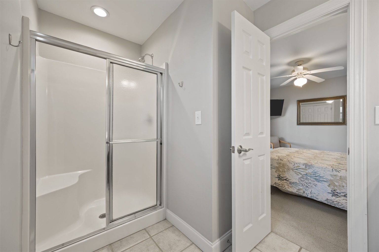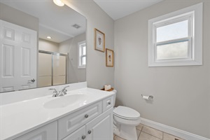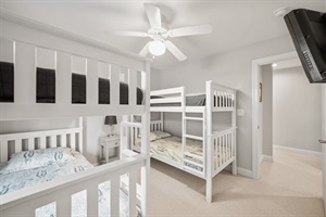On the second level of this home, you will find two additional Queen bedrooms, a bunk room adorned with twin bunks and two full bathrooms. The first Queen bedroom features an ensuite bath, a large screened in deck and coastal vibes. The additional Queen bedroom conveniently shares a Jack and Jill bath with the bunk room. Each bedroom is equipped with a ceiling fan, TV and a closet. There's ample space for all to find solace and comfort!