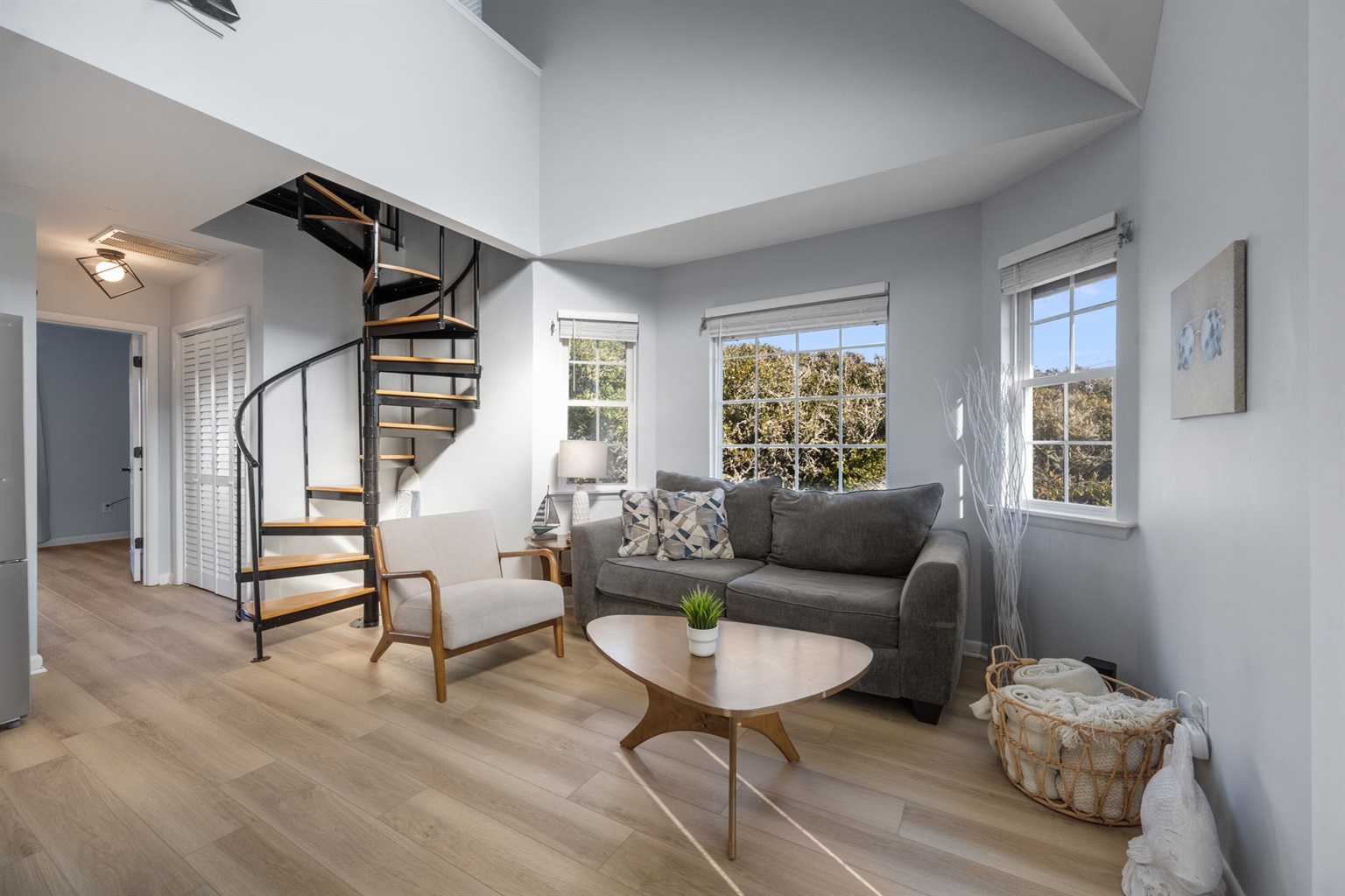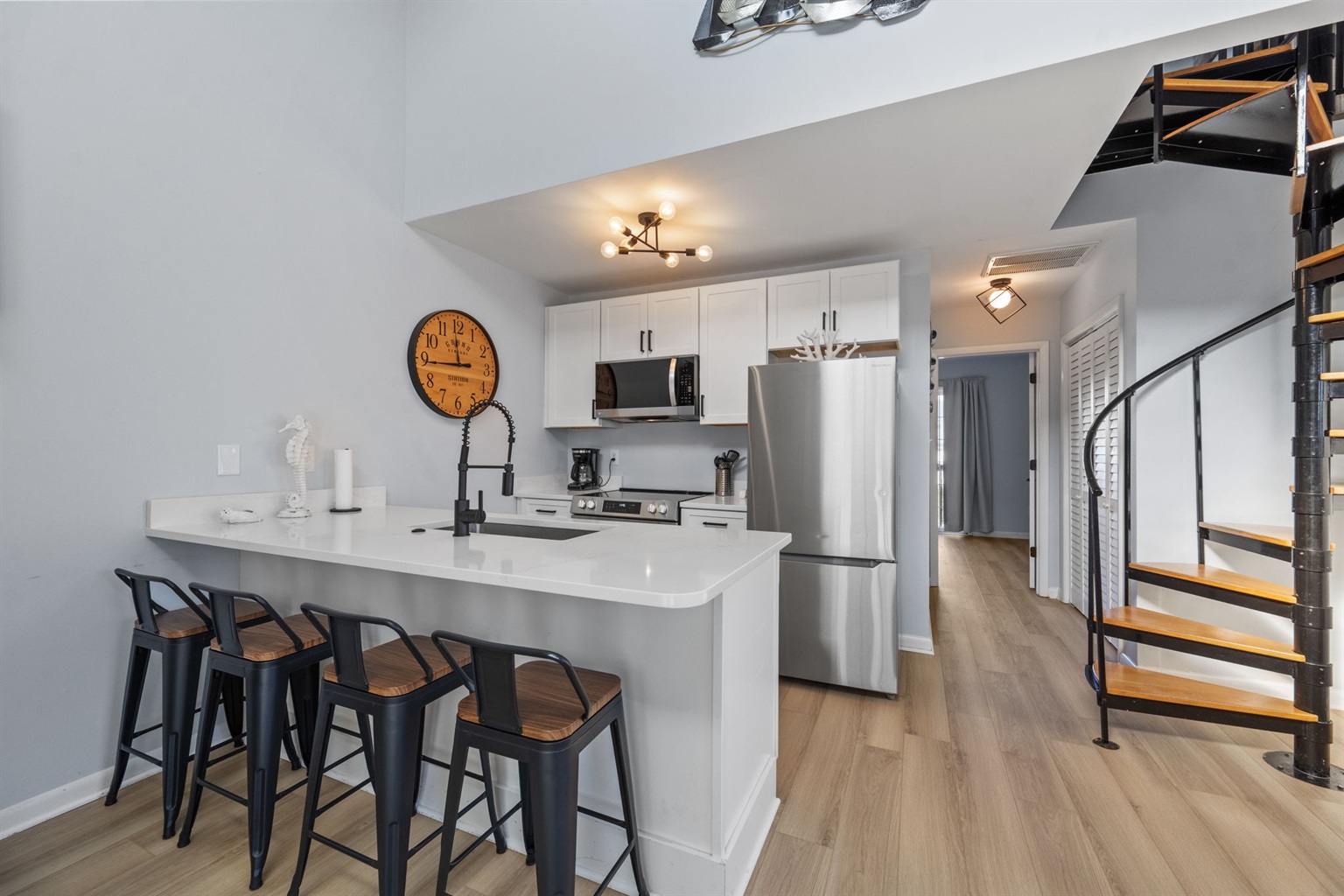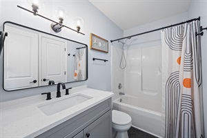 Step inside to a bright, open layout with modern coastal style and all the comforts of home. Enjoy a fully equipped kitchen with updated appliances including coffee maker, blender, toaster & more, perfect for home-cooked meals or beachside snacks. A cozy dining table for four sits just off the kitchen—perfect for casual meals, morning coffee, or evening board games. The living area offers comfortable seating, a smart TV, and views of the ocean. The sofa pulls out to a full-sized bed to accommodate two people. Both bedrooms feature plush queen beds, smart TVS, linens, ceiling fans and ample storage. The primary bedroom is located on the first floor and features a private, sound facing balcony and an attached full bathroom. The upstairs bedroom (loft) provides an additional private bathroom. The home can comfortably accommodate a total of 5 adults OR 4 adults and 2 children.