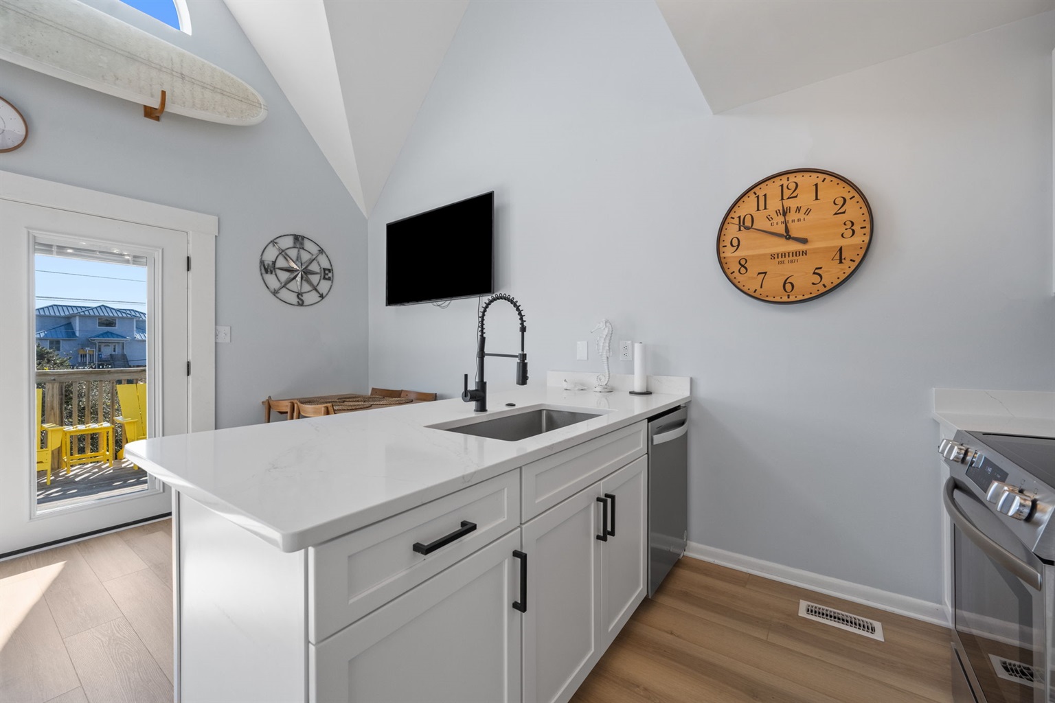 The attached deck off the living area invites you to relax and unwind with ocean views as your backdrop. Whether you're enjoying a quiet morning coffee as the sun rises over the water or gathering with friends for an evening cocktail, the deck offers a front-row seat to the sights, sounds, and salty breeze of the sea. Just steps away, direct beach access across the street makes it effortless to dip your toes in the sand or take a morning stroll along the shoreline. For your convenience, beach chairs and a wagon are provided, so you can easily pack up your essentials for a perfect day by the water.